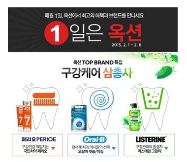 구강관리 캠페인으로 구강관리 순서를 맞추면 100% 경품이 당첨되는 이벤트를 진행한다. 이벤트 페이지에서 구강청결제와 칫솔질, 치실 사용의 바른 순서를 맞추면 최소 옥션포인트 100점을 제공하고, 추첨을 통해 구강용품패키지(리스테린 500ml, 페리오 마우스 스프레이, 오랄비 칫솔/700명) 등을 증정한다.