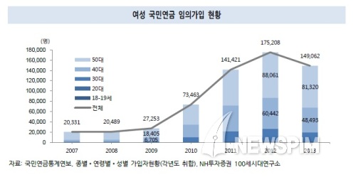 김 연구원은 "한때 국민연금은 강남권 주부들 사이에 크게 입소문을 타며 재테크 수단으로 떠올랐다"며 "지난 2009년 이후 국민연금 여성 임의 가입자수는 40~50대 이상에서 급속히 증가했다"고 말했다. 40대와 50대 여성의 국민연금 임의가입 수는 지난 2008년 4474명, 1만4808명에서 5년 뒤인 2013년 4만8493명, 8만1320명으로 급증했다.