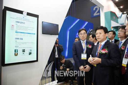 | 에스원이 일산 킨텍스에서 개최된 'SECON 2015' 세계보안엑스포에 참가했다. 에스원 육현표 사장이 임종인 청와대 안보특별보좌관, 김용남 국회의원, 이이재 국회의원, 이상철 한국시큐리티연구원장 등 VIP참석자들에게 에스원의 UWB센서 기술을 설명하는 모습. |