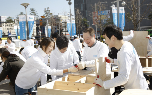 | ▲ 박용만 회장이 3월 23일‘두산인 봉사의 날`행사를 맞아 서울 중구 을지로 두산타워 광장에서 임직원 200여 명과 함께 지역사회 저소득층 가정에 전달될‘따뜻한 가구 만들기’작업에 나섰다. |