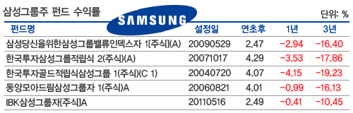 수익률도 부진한 모습이다. 상장지수펀드(ETF)를 포함한 삼성그룹주펀드는 연초이후 4.01%의 수익을 내고 있지만 이는 일반주식형펀드 수익률 6.19%를 밑도는 수치다.