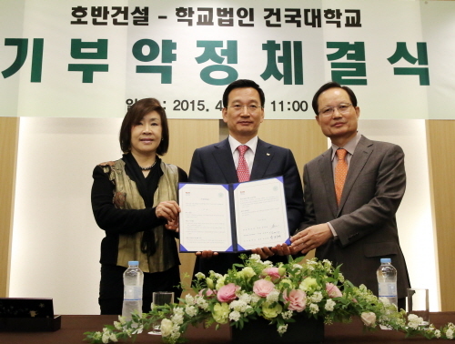 | (좌측부터) 건국대 김경희 이사장과 호반건설 김상열 회장, 건국대 송희영 총장이 기부약정 체결식을 진행하고 있다.<사진제공=호반건설> |