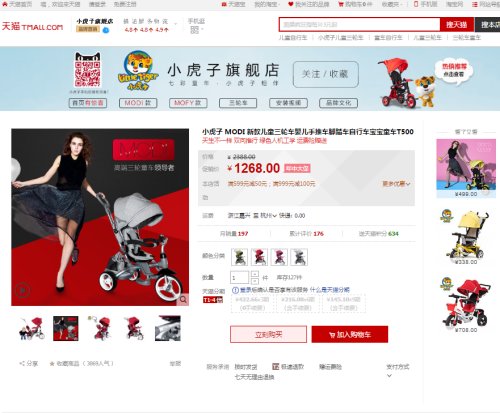 | ▲중국 최대 B2C 전자상거래업체인 티몰에서 판매되고 있는 삼천리자전거 유아용자전거 모디(MODI)<사진=모디 판매제조사 리틀타이거의 티몰 내 판매 페이지 캡처> |