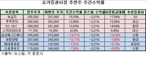 대신증권이 추천한 쿠쿠전자는 전 주 보다 12.85% 오른 30만3000원으로 거래를 마쳤다. 상승률은 시장평균을 15.06%포인트 웃돈 수치다.