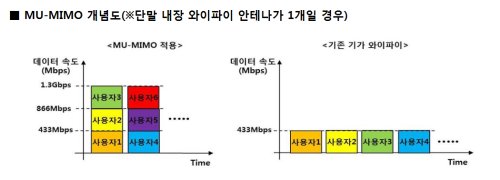 하지만, ‘MU-MIMO’ 상용화 시 1.3Gbps를 3명에게 433Mbps씩 나눠서 보내거나, 2명에게 866Mbps와 433Mbps로 나눠서 보내는 방식으로 서비스가 가능해 효율적인 기가 와이파이 망 사용이 가능해진다.
