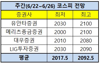 21일 뉴스핌이 국내 주요 4개 증권사의 이번 주간(6월22일∼26일) 코스피 전망치를 조사한 결과, 최저점 2000·최고점 2100포인트로 조사됐다. 또 최저점과 최고치 평균은 각각 2017.5, 2092.5이었다.
