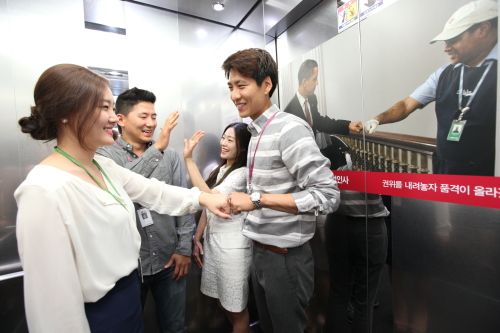 29일 LG생활건강에 따르면 LG광화문 빌딩 내 전용 엘리베이터 3대의 안쪽 문에 오바마의 주먹 인사, 손뼉 마주침, 옆사람과 인사 등의 문구와 이미지가 붙어있다. 인사를 생활화해서 상호 존중하는 기업문화를 만들자는 취지로 캠페인이 기획됐다.