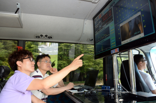 | <사진설명> ETRI 연구원들이 실시간 동영상과 신호 품질을 바라보며 버스에서 이동시연을 하고 있다 |