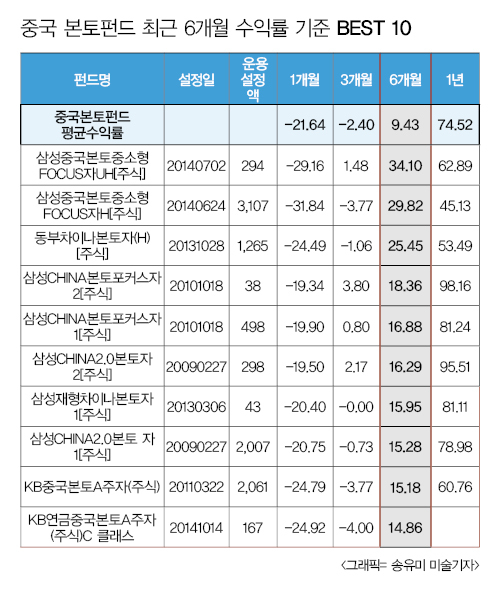 예를들어 '삼성중국본토중소형FOCUS자[주식]'펀드는 환노출형과 환오픈형 모두 최근 6개월 수익률에서는 1~2위를 기록했다. 환오픈형은 34.1%, 환노출형은 29.82%의 높은 수익률을 기록했다.