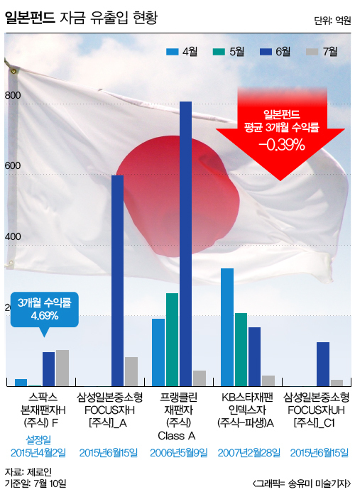 지난 4월 2일 출시된 스팍스본재팬펀드는 석달만에 219억원의 자금을 끌어모았다. 이달 들어서만 102억원이 유입, 국내 일본펀드 가운데 가장 많은 자금이 들어왔다. 수익률도 양호하다. 3개월 수익률은 4.69%(제로인 기준)로 같은 기간 일본펀드 평균 수익률인 -0.39%를 앞섰다.