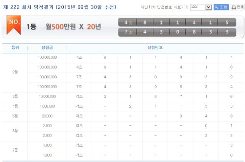 30일 추첨한 222회차 연금복권 520의 1등 당첨번호는 4조811415와 7조430833이다.