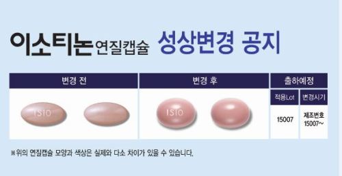 최근 이소티논의 제조자가 변경되면서, 타원형이었던 낱알모양이 달걀형으로 바뀐 것이다. 이같은 내용은 이소티논 제조번호 15007부터 적용되며, 2015년 11월부터 변경된 제품이 유통될 예정이다. 제품명 및 약가, 적응증, 처방가능 상병코드 등은 기존과 동일하다.