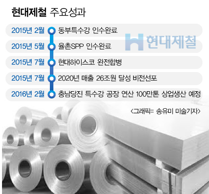 현대제철은 지난 7월 1일 현대하이스코를 합병해 자산 31조 원, 매출 20조 원의 대형 철강사로 발돋움했다. 고로에서 열연강판 등을 생산하는 현대제철과 이를 가공해 제품을 완성하는 현대하이스코가 하나로 합쳐지면서 철강 제조의 전 공정을 아우르는 종합철강사가 됐다.