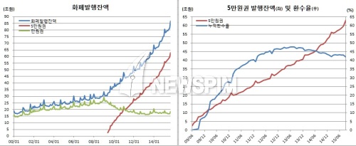 [뉴스핌=김남현 기자] 추석연휴에 따른 자금방출 등으로 화폐발행잔액이 급증했다. 석달연속 증가세를 이어가면서 86조원을 돌파했다. 5만원권도 6개월째 사상최고치를 경신하면서 63조원에 육박했다. 반면 5만원권 환수율은 석달째 감소세를 보이면서 3년8개월만에 가장 낮았다.