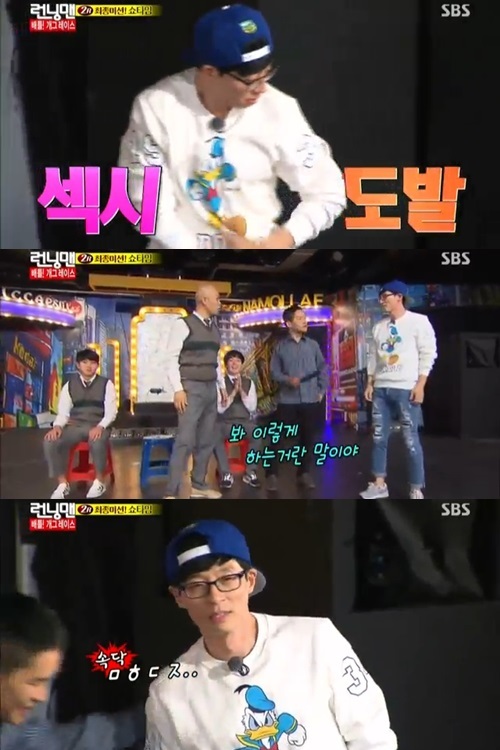 | ‘런닝맨’ 유재석이 ‘웃찾사’ 무대에서 ‘무한도전’표 섹시 댄스를 선보였다. <사진=‘런닝맨’ 방송 캡처> |