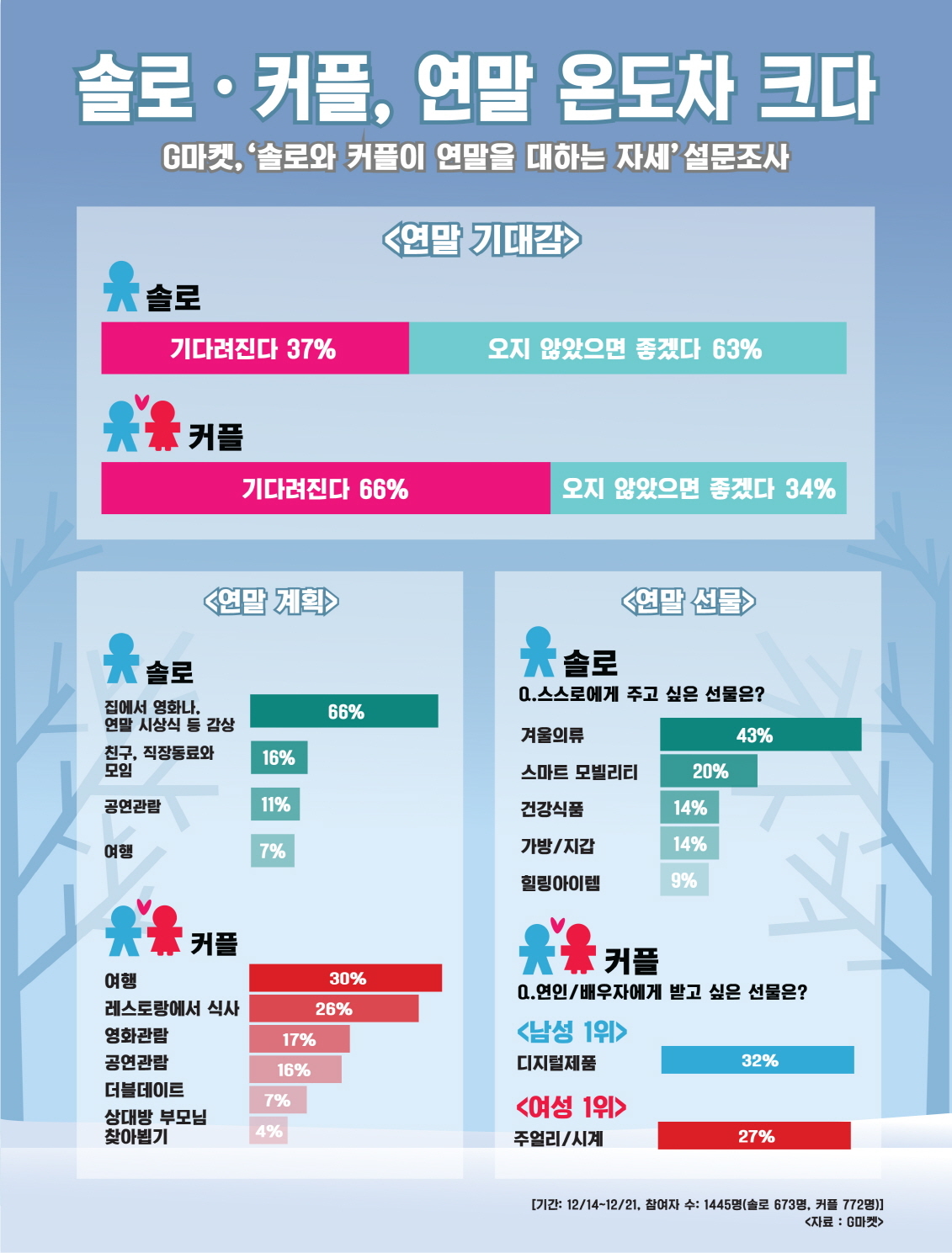 G마켓은 연말을 앞두고 14일부터 21일까지 솔로 673명과 커플 772명, 총 1445명의 고객을 대상으로 설문조사를 진행한 결과 솔로 10명 중 6명(63%)이 ‘연말이 오지 않았으면 좋겠다’고 답했다고 28일 밝혔다. 반면 커플은 정반대로 66%가 ‘연말이 기다려진다’고 답했다.