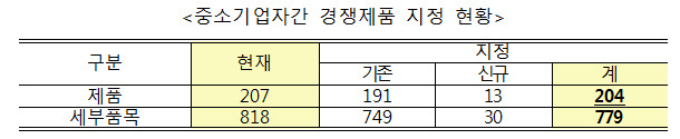 중소기업자간 경쟁 제품 지정제는 중소기업 보호를 위해 도입한 제도다. 정부와 지방자치단체를 포함한 공공기관은 이번에 지정된 204개 제품을 구매할 때 중소기업과 우선적으로 계약해야 한다. 대기업과 중견기업은 입찰에 참여할 수 없으며 중소기업끼리만 경쟁해 계약자를 선정한다.