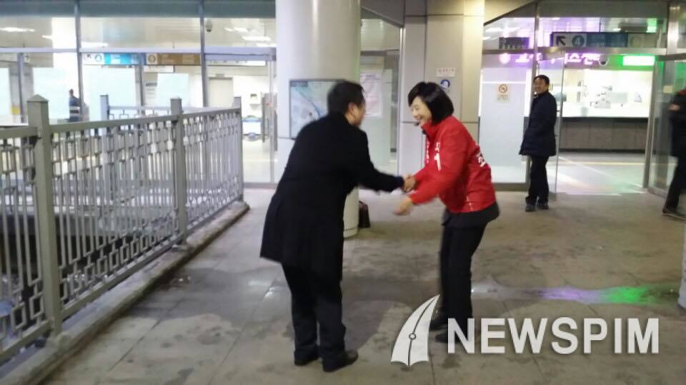 | 출근길 시민과 악수하는 조윤선 후보 <사진=조윤선 페이스북> |