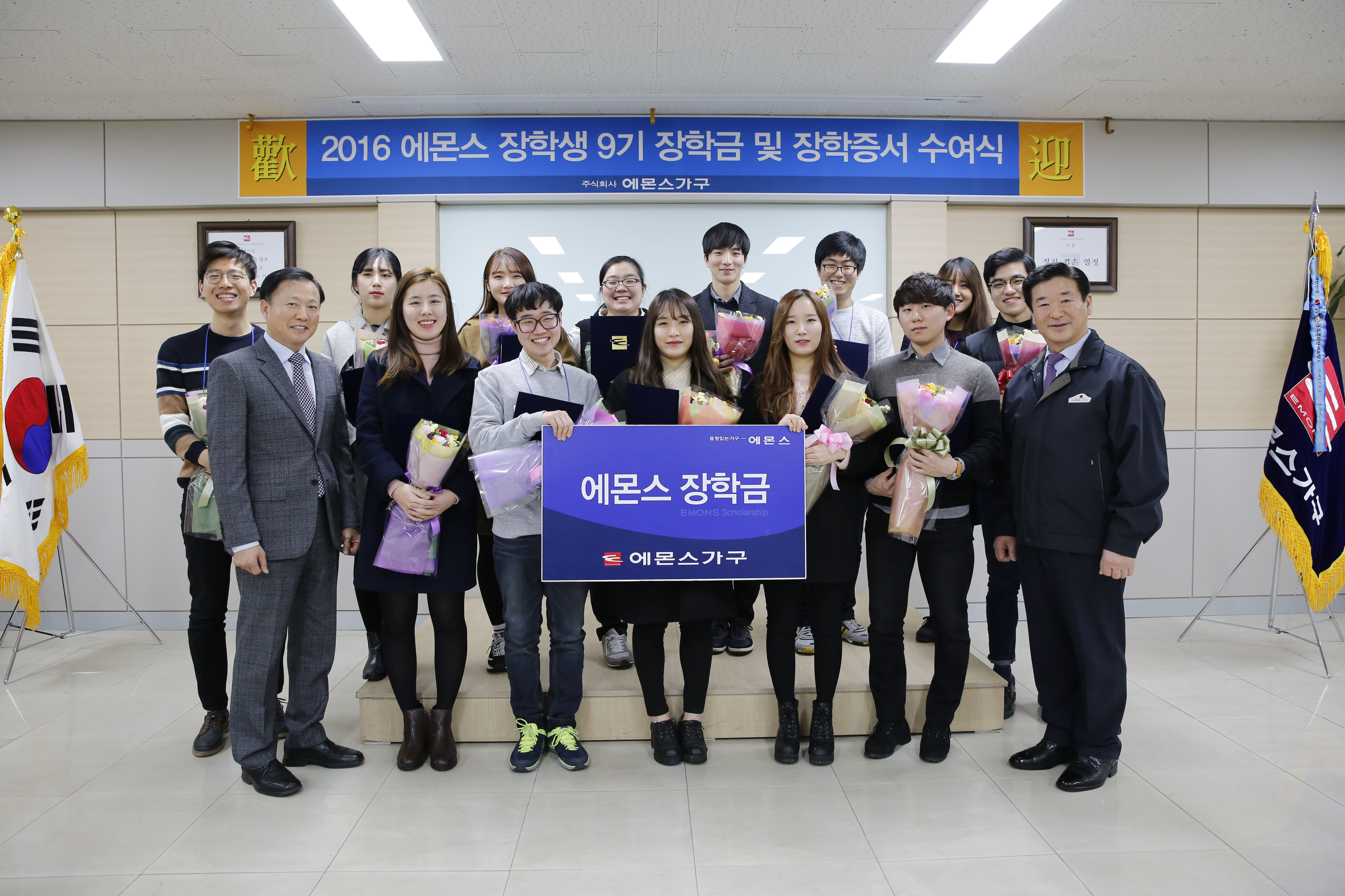 [뉴스핌=강필성 기자] 에몬스가구(대표 김경수)는 지난 18일 인천 고잔동 소재 본사에서 ‘2016 에몬스 장학생(9기)’ 장학금 및 장학증서 수여식을 개최했다고 21일 밝혔다.
