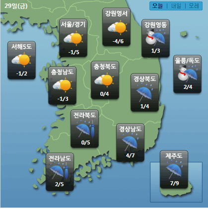 [뉴스핌=김겨레 기자] 오늘(29일)은 전국이 대체로 흐리고 충청이남에 비 또는 눈이 내린 후 개겠다. 강원도 영동 지방도 흐려져 눈 또는 비가 오겠고, 제주도 남쪽해상을 지나는 저기압의 영향을 받겠다.