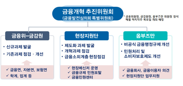 현장점검반을 통해 금융회사뿐만 아니라 금융소외계층, 지방거주자, 주부 등으로 현장 실태조사 및 과제 발굴 대상도 확대한다.오는 26일 민간 중심의 '옴부즈만'도 본격 가동해 비공식 금융행정규제 및 민원·소비자보호 제도를 점검하고 개선을 권고할 예정이다.