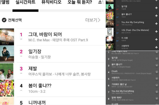 사진에는 한 음원 사이트의 실시간차트가 담겨졌다. 1위 엠씨더맥스의 '그대, 바람이 되어'를 이어 2위에 이름을 올린 이승철의 '일기장'이 눈에 띈다.