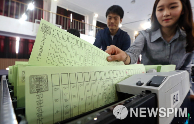[뉴스핌=김학선 기자] 제20대 국회의원선거를 하루 앞둔 12일 오후 서울 여의도고등학교에 설치된 개표소에서 선관위 관계자들이 투표지분류기를 점검하고 있다.