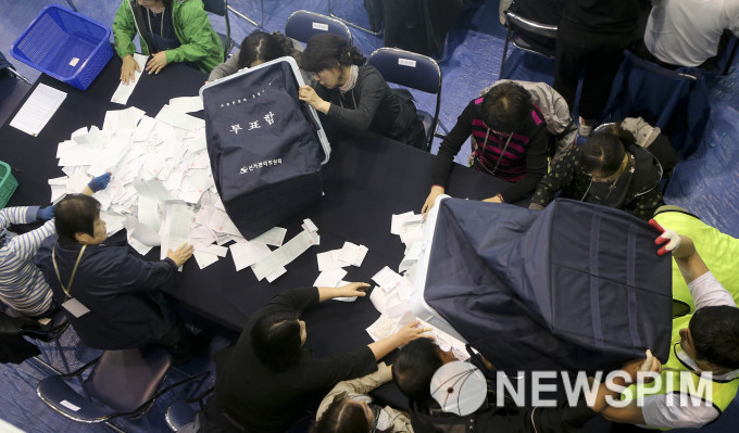 [뉴스핌=이형석 기자] 제20대 국회의원 선거일인 13일 오후 서울 여의도 여의도고등학교 개표소에서 개표원들이 개표작업을 하고 있다.