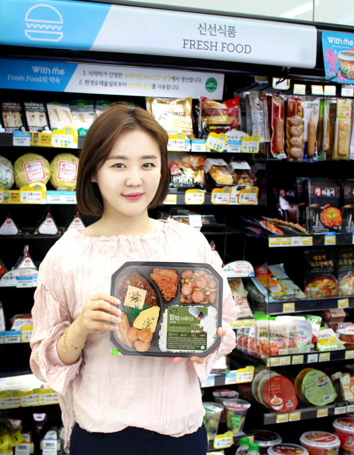 ‘함박 스테이크 도시락’은 메인 메뉴인 ‘함박스테이크’(100g)의 중량을 경쟁사 대비 2배 가량 늘렸다. 스테이크 패티는 우육과 돈육, 두부를 배합해 만들었으며 양송이와 양파가 들어간 소스를 사용했다. 여기에 치즈오믈렛과 치킨볼, 소시지 야채볶음 등의 4가지 사이드 메뉴를 구성했다.