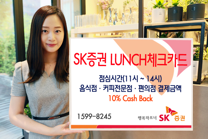 ‘SK증권 LUNCH 체크카드’는 별도의 연회비 없이 점심식사 시간 (오전 11시~오후 2시)에 음식점, 커피전문점, 편의점 업종에서 결제할 경우 결제금액의 10%를 캐시백해주는 직장인을 위한 특화상품이다. 또한 VIP 조건을 중족하는 고객은 추가 캐시백 혜택도 받을 수 있다.