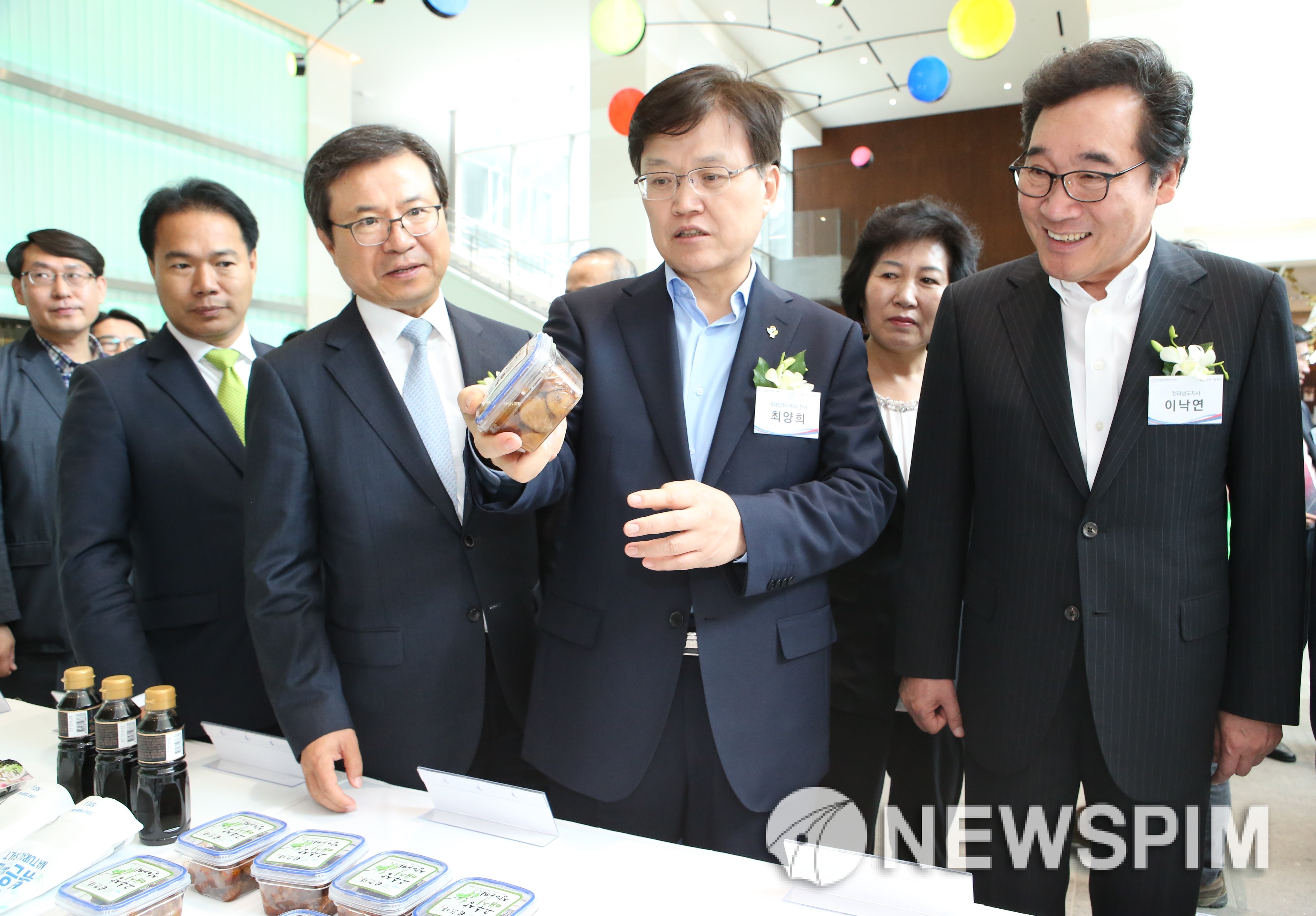 | 16일 오전 전남 여수 예울마루에서 열린 전남창조경제혁신센터 출범 1주년 기념행사에서 최양희 미래부장관(사진 오른쪽 2번째), 이낙연 전남도지사(오른쪽 1번째), 정택근 GS 사장 (오른쪽 3번째), 이용주 국회의원(오른쪽 4번째) 등이 참석한 가운데 전남창조경제혁신센터의 1주년 성과와 활동을 돌아보고, 입주기업인 '유세나라'의 농수산식품 짱아찌세트를 살펴보고 있다. <사진=GS> |