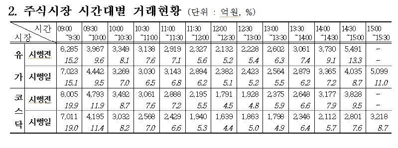 또 연장된 시간대인 오후3시~3시30분까지의 거래금액은 이날 하루 거래금액 가운데 11%인 5099억원을 기록했다. 제도 변경전 마감 시간대인 오후2시30분~3시까지 거래금액은 5491억원으로 13.3% 비중을 차지했다.