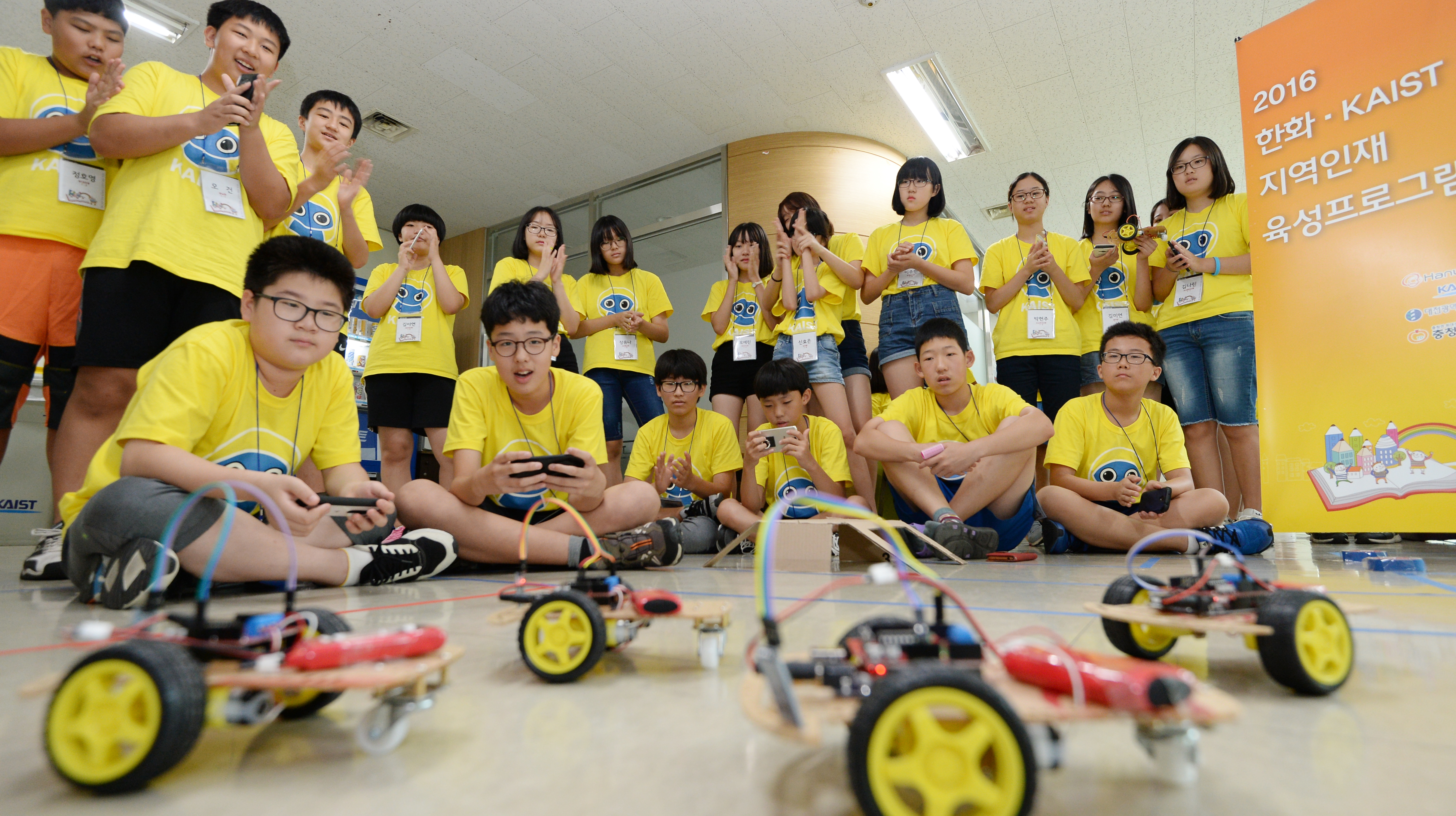 | '융합과학 탐구캠프'에 참여한 학생들이 직접 만든 무선조종 RC 자동차를 조종하고 있다. <사진=한화> |