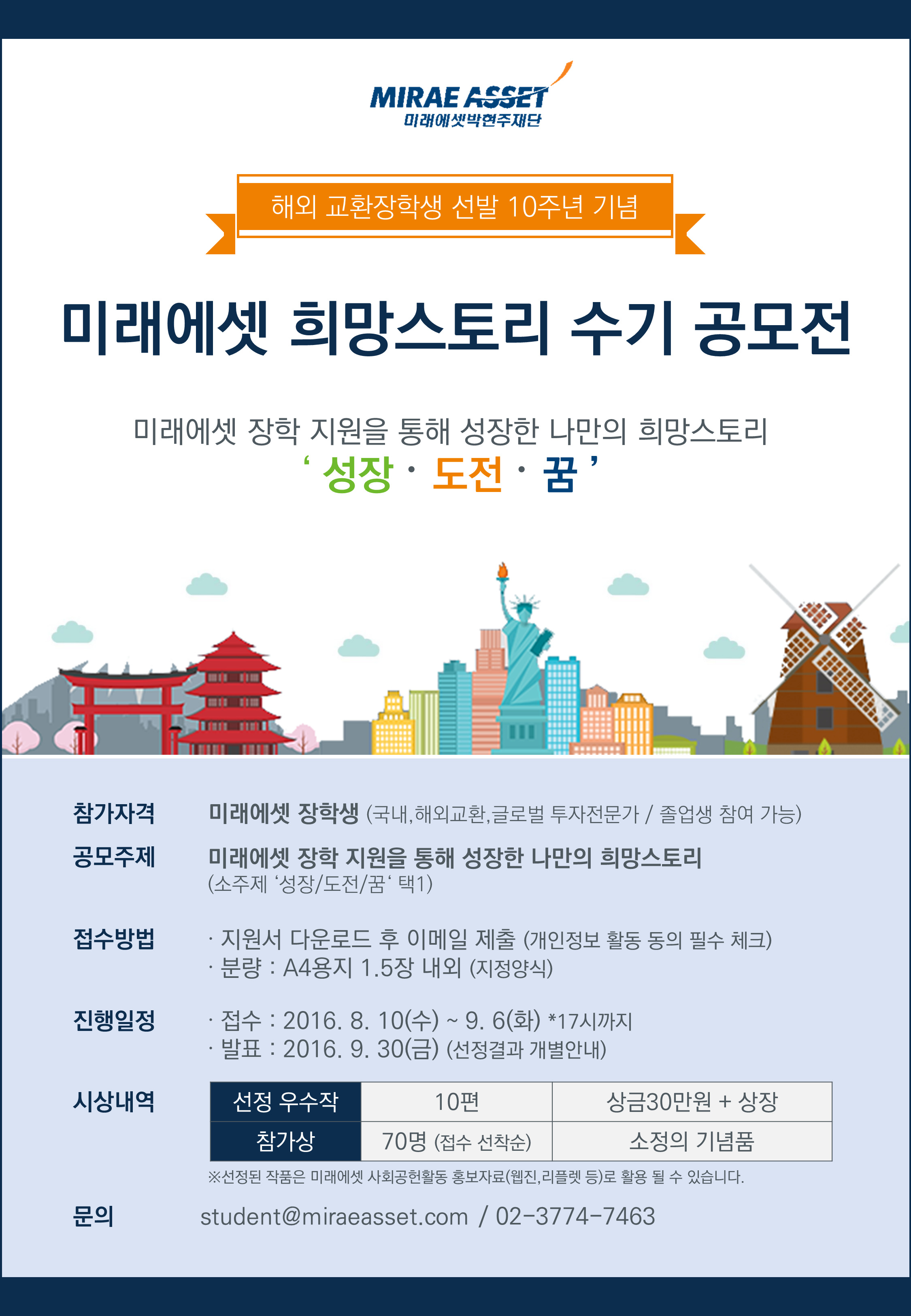 이번 공모전은 미래에셋 해외교환 장학생 선발 10주년을 기념하고, 전 세계를 무대로 활약한 미래에셋 장학생들의 희망스토리를 통해 대한민국의 청소년에게 꿈과 희망을 줄 수 있는 계기를 만들고자 진행한다.