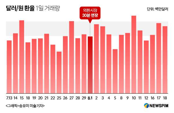 하지만 아직까지 효과는 미미한 상황이다. 19일 코스콤에 따르면 이달 1일 이후 14거래일 동안 달러/원 하루 평균 거래량은 86억1300억달러로 집계됐다. 연장 도입 전인 2015년 8월 1일부터 올해 7월 29일까지 1년 동안 하루 평균 거래 규모는 84억 달러다. 30분 연장 이후 2억달러 가량 는 것이다.