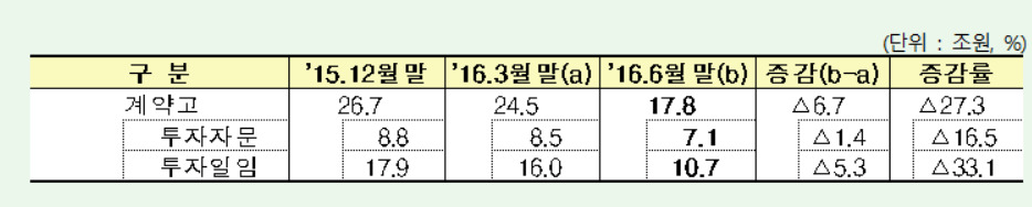 지난 분기에 13개 투자자문사가 전문사모집합투자업자로 전환된 영향이다. 이에 해당 계약고 5조8000억원이 집계대상에서 제외됐다. 지난 6월말 기준으로 자문·일임계약고는 17조8000억원으로 지난 3월말 24조5000억원에서 27.3% 감소했다