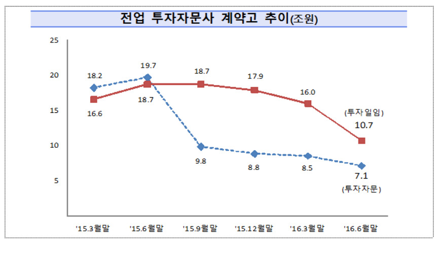 이에 따르면 투자자문사 계약고는 지난해 6월말 38조4000억원에서 올 6월말 17조8000억원으로 20조원 이상 감소했다. 지난 분기에만 6조8000억원이나 줄었다.