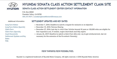이에 현대차는 해당 제품을 구매한 고객 88만5000명에게 무상 엔진 점검과 수리, 파워트레인의 보증 연장(신차 고객 10년/10만마일→10년/12만마일, 중고차 고객 5년/6만만일→10년/12만마일), 기 지출된 수리·견인·렌터카 비용 등을 보상키로 합의했다.
