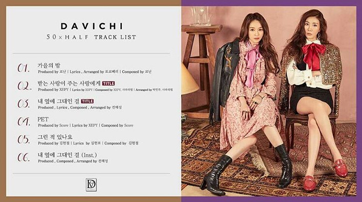 다비치 이해리는 13일 음원 공개 직후 "잘 들어주세요 #다비치 #DAVICHI #이해리 #강민경 #50xHALF #halfbyhalf"라며 앨범 재킷과 트랙리스트를 공개했다.