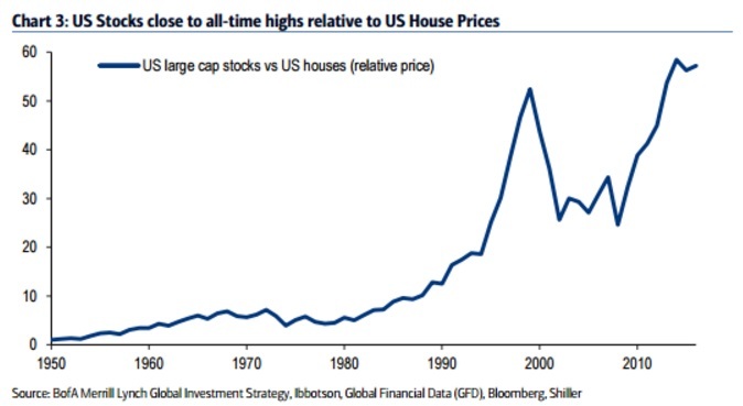 BOA-메릴린치의 마이클 하트넷 수석 투자 전략가는 최근 발표한 보고서에서 현재 미국 부동산 대비 주식의 가격이 통계 조사를 시작한 1926년 이후 사상 최고치라고 강조했다. 이는 닷컴버블이 발생했던 1990년대 후반보다도 높은 수준이다.