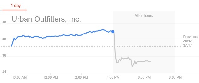 이날 정규장에서 5% 상승한 채 마감했던 어반아웃피터스 주가는 부진한 실적 발표에 시간외 거래에서 9% 넘게 폭락했다.