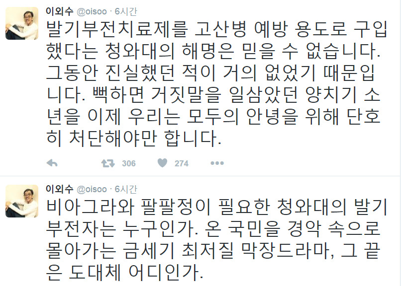 이어 이외수는 "발기부전치료제를 고산병 예방 용도로 구입했다는 청와대의 해명은 믿을 수 없습니다. 그동안 진실했던 적이 거의 없었기 때문입니다"라며 "뻑하면 거짓말을 일삼았던 양치기 소년을 이제 우리는 모두의 안녕을 위해 단호히 처단해야만 합니다"라고 주장했다.