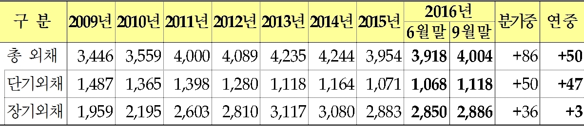 [세종=뉴스핌 정경환 기자] 기획재정부는 2016년 3분기 말 기준 총외채가 4004억달러로 전기(6월 말) 대비 86억달러 증가했다고 30일 밝혔다.