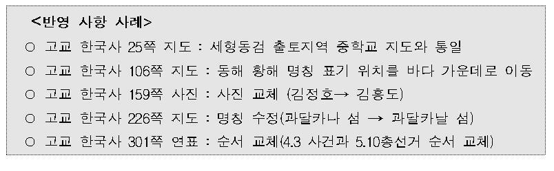 교육부에 따르면 의견 반영이 결정된 13건은 명백한 오류 지적이나 단순 개선사항이 대부분이다. 고교 한국사 교과서의 세형동검 출토지역 지도를 중학교 지도와 통일하고 동해·황해 등 명칭 표기 위치를 바다 가운데로 이동하는 등의 내용이다. 인물사진이 잘못 첨부돼 이를 변경하거나 잘못된 명칭 수정, 연표의 순서 교체 등도 포함된다.