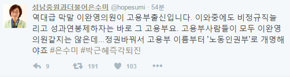 은수미 의원은 6일 자신의 트위터에 "역대급 막말 이완영 의원이 고용부 출신입니다. 이와중에도 비정규직 늘리고 성과연봉제하자는 바로 그 고용부요. 고용부사람들이 모두 이완영 의원같지는 않은데"라며 "정권을 바꿔서 고용부 이름부터 '노동인권부'로 개명해야죠 #은수미 #박근혜즉각퇴진"이란 글을 게시했다.