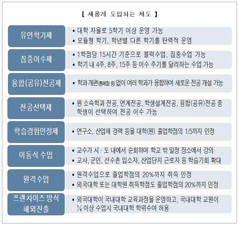 이번 개선안은 ▲학사제도 유연화 ▲창의·융합교육 확대 ▲시공간 제약없는 이동·원격수업 ▲국내 대학의 해외 진출 발판 마련 4가지에 초점을 맞춰 마련됐다.