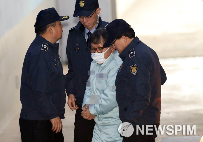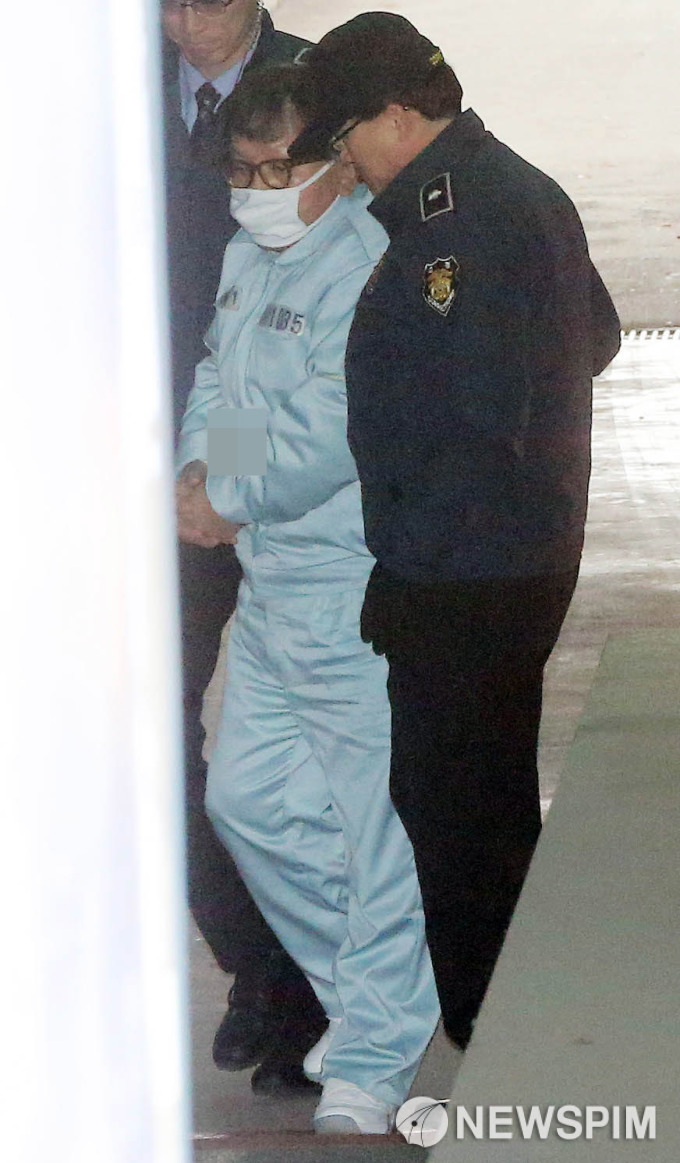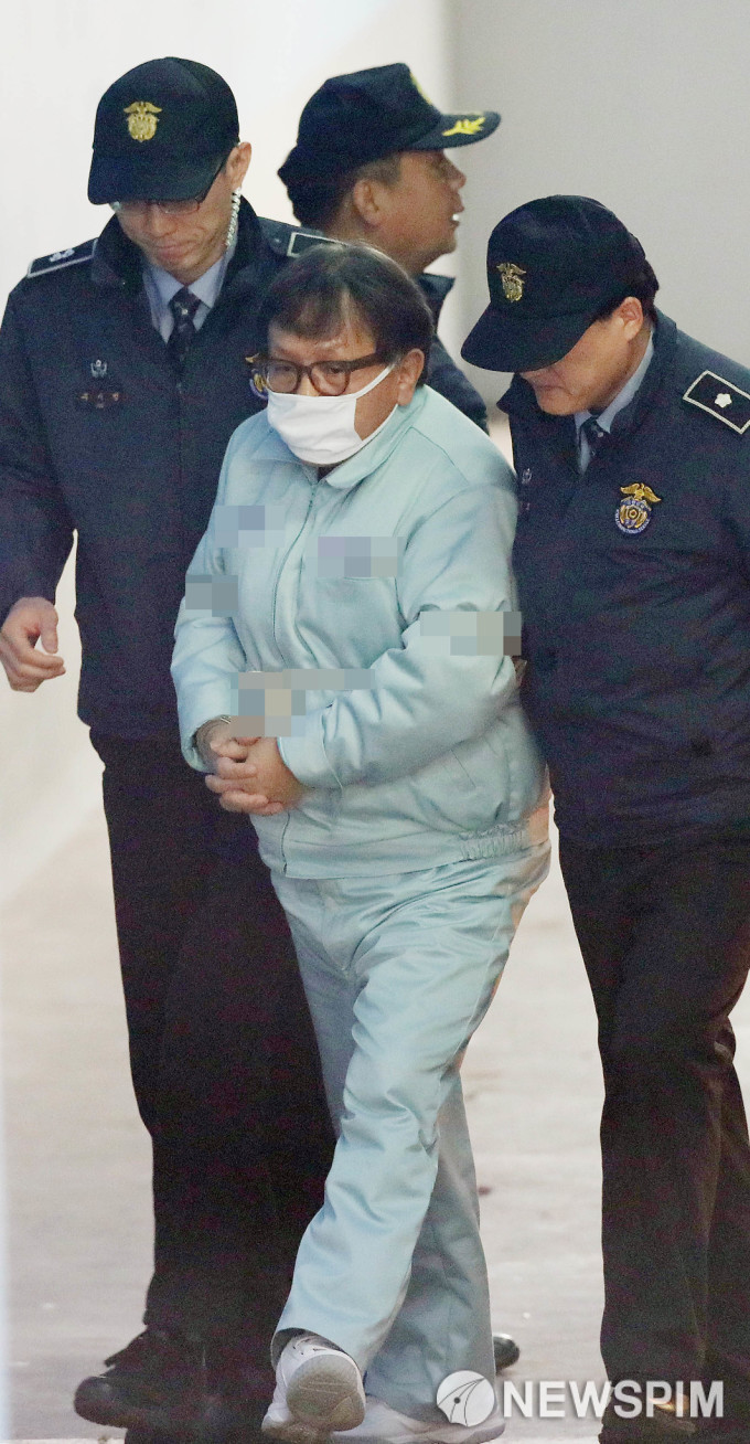 [뉴스핌=이형석 기자] 옛 포스코 계열 광고사 '포레카' 강탈 시도에 관여한 혐의(강요미수)로 구속된 송성각 전 한국콘텐츠진흥원장이 19일 서울 서초구 서울중앙지법에서 열린 첫 재판에 출석하고 있다.