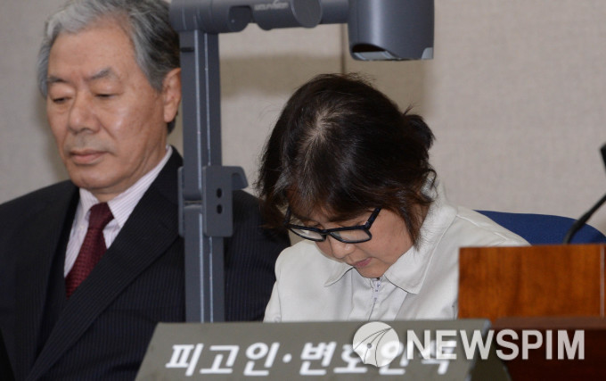 | 최순실 씨(오른쪽)가 19일 오후 서초구 서울중앙지법 대법정에서 열린 국정농단사건 첫 재판을 준비하고 있다. 최순실씨 왼쪽은 최씨의 변호를 맡은 이경재 변호사 <사진공동취재단> |