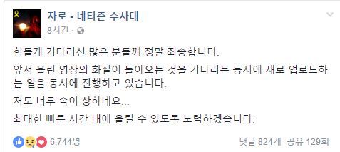 이에 대해 자로는 페이스북에 올린 최신 글에서 "힘들게 기다리신 많은 분들께 죄송하다. 앞서 올린 영사으이 화질이 돌아오는 것을 기다리는 동시에 새로 업로드하는 작업을 진행 중이다"고 설명했다.