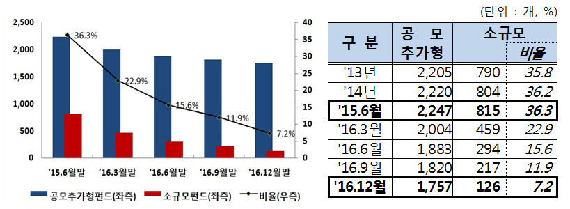 지난해 말 기준 공모추가형 펀드를 운용 중인 자산운용사(53개사) 중 감축 목표비율(5%)을 충족한 운용사는 23개사로 소규모 펀드가 전혀 없는 운용사도 KTB, 흥국, 현대 등 10개사로 집계됐다.